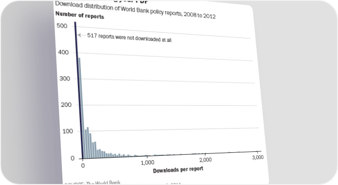 The World Bank recently decided to ask an important question: Is anyone actually reading these things? They dug into their Web site traffic data and came to the following conclusions: Nearly one-third of their PDF reports had never been downloaded, not even once. Another 40 percent of their reports had been downloaded fewer than 100 times. Only 13 percent had seen more than 250 downloads in their lifetimes. Since most World Bank reports have a stated objective of informing public debate or government policy, this seems like a pretty lousy track record.
