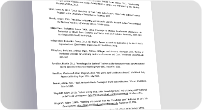 References Center for Research Libraries Academic Database Assessment Tool, last accessed April 28, 2014. http://adat.crl.edu/. Delgado López-Cózar, Emilio, Nicolás Robinson-García, Daniel Torres Salinas. 2012. “Manipulating Google Scholar Citations and Google Scholar Metrics: simple, easy and tempting” EC3 Working Papers 6:29 May, 2012. Gann, James G. 2012. “2012 Global Go To Think Tanks Index Report.” Think Tanks and Civil Societies Program at the University of Pennsylvania. December 2012. Hirsch, Jorge E. 2005. “And Index to Quantify an Individual’s Scientific Research Output.” Proceedings of the National Academy of Sciences 102(46): 16569–16572. Independent Evaluation Group. 2008. Using Knowledge to Improve Development Effectiveness: An Evaluation of World Bank Economic and Sector Work and Technical Assistance, 2000–2006. Washington DC: World Bank Group. Independent Evaluation Group. 2012. The Matrix System at Work: An Evaluation of the World Bank’s Organizational Effectiveness. Washington DC: World Bank Group. Mihaylova, Borislava, Andrew Briggs, Anthony O’Hagan, and Simon G. Thompson. 2011. “Review of Statistical Methods for Analysing Healthcare Resources and Costs.” Healthcare Economics. 20: 897–916 Ravallion, Martin. 2011. “Knowledgeable Bankers? The Demand for Research in World Bank Operations.” World Bank Policy Research Working Paper 5892. December 2011. Ravallion, Martin and Adam Wagstaff. 2010. “The World Bank’s Publication Record.” World Bank Policy Research Working Paper 5374. July 2010. Reeves, Alison. 2011. “Book Review & Media Coverage of World Bank Publications.” Mimeo, World Bank. March 2011. Wagstaff, Adam. 2012a. “Who’s writing what in the ‘Knowledge Bank’? And is it being used?” Published on Let’s Talk Development. http://blogs.worldbank.org/developmenttalk. October 4, 2012. Wagstaff, Adam. 2012b. “Tracking withdrawals from the ‘Knowledge Bank’” Published on Let’s Talk Development. http://blogs.worldbank.org/developmenttalk. September 25, 2012. Winkelmann, Rainer. 2008. Econometric Analysis of Count Data. 5th edition. Berlin: Springer-Verlag. World Bank. 2000. Poverty Reduction and Global Public Goods: Issues for the World Bank in Supporting Global Collective Action. September 9, 2000. Washington DC: World Bank Group. 24