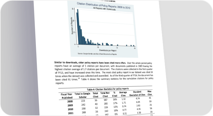 citations. The distribution of citations is skewed like the distribution of downloads and is entered on zero and low numbers. Of the 147 policy reports that were cited, only 93 were cited between 1 and 5 times. Those policy reports with more than 5 (the “knee of the curve”) citations consist of 54 policy reports, or 3 percent of the data sample. Figure 7: Citation Distribution Citation Distribution of Policy Reports: 2008 to 2012 All Reports with Downloads 30 s t or20 ep R of er b um10 N 0 0 20 40 60 Downloads per Report Source: Google Scholar and World Bank Documents & Reports. Similar to downloads, older policy reports have been cited more often. Over the whole period policy reports have an average of 1 citation per document, with documents published in 2009 having the highest citation average of 1.7 citations per document. The citations were collected in the first quarter of FY13, and have increased since this time. The most cited policy report in our dataset was cited 59 times when the dataset was collected and assembled. As of the third quarter of FY14, the document has been cited 91 times.24 Table 4 shows the summary statistics for the cumulative citations for policy reports. Table 4: Citation Statistics for policy reports Fiscal Year Total in Google Total Total Not % Average Standard Max Published Scholar Cited Cited Cited Cites Deviation of Cites Cites 2008 223 36 187 16% 1.32 4.74 41 2009 242 40 202 17% 1.71 6.94 59 2010 258 32 226 12% 0.74 2.82 25 2011 268 26 242 10% 0.77 4.35 56 2012 210 13 197 6% 0.21 1.50 20 2008–2012 1201 147 1054 12% 0.96 4.51 59 Source: Google Scholar and World Bank Documents & Reports. 24 This policy report is cited more since it was published in the peer-reviewed journal Agricultural Economics. 15